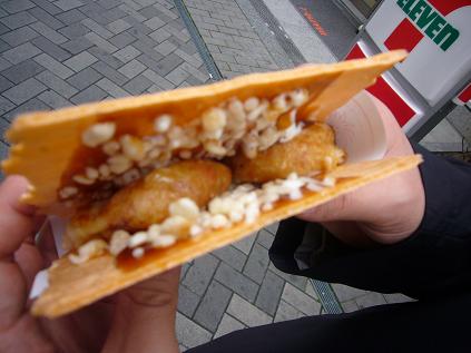 せんべいの間からソースとマヨネーズがにょろっとでてくるのです。