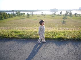 前に走っているパパの後ろで花が