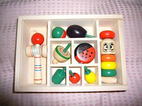 けんだま。だるまおとし。ヨーヨー。こま。野菜のこまたち。