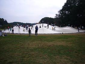 白いなんともでかい山トランポリン?みたいなやつ。